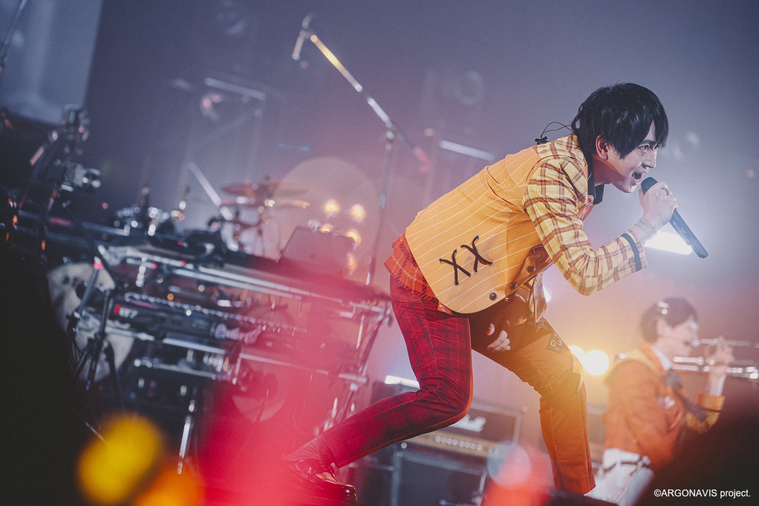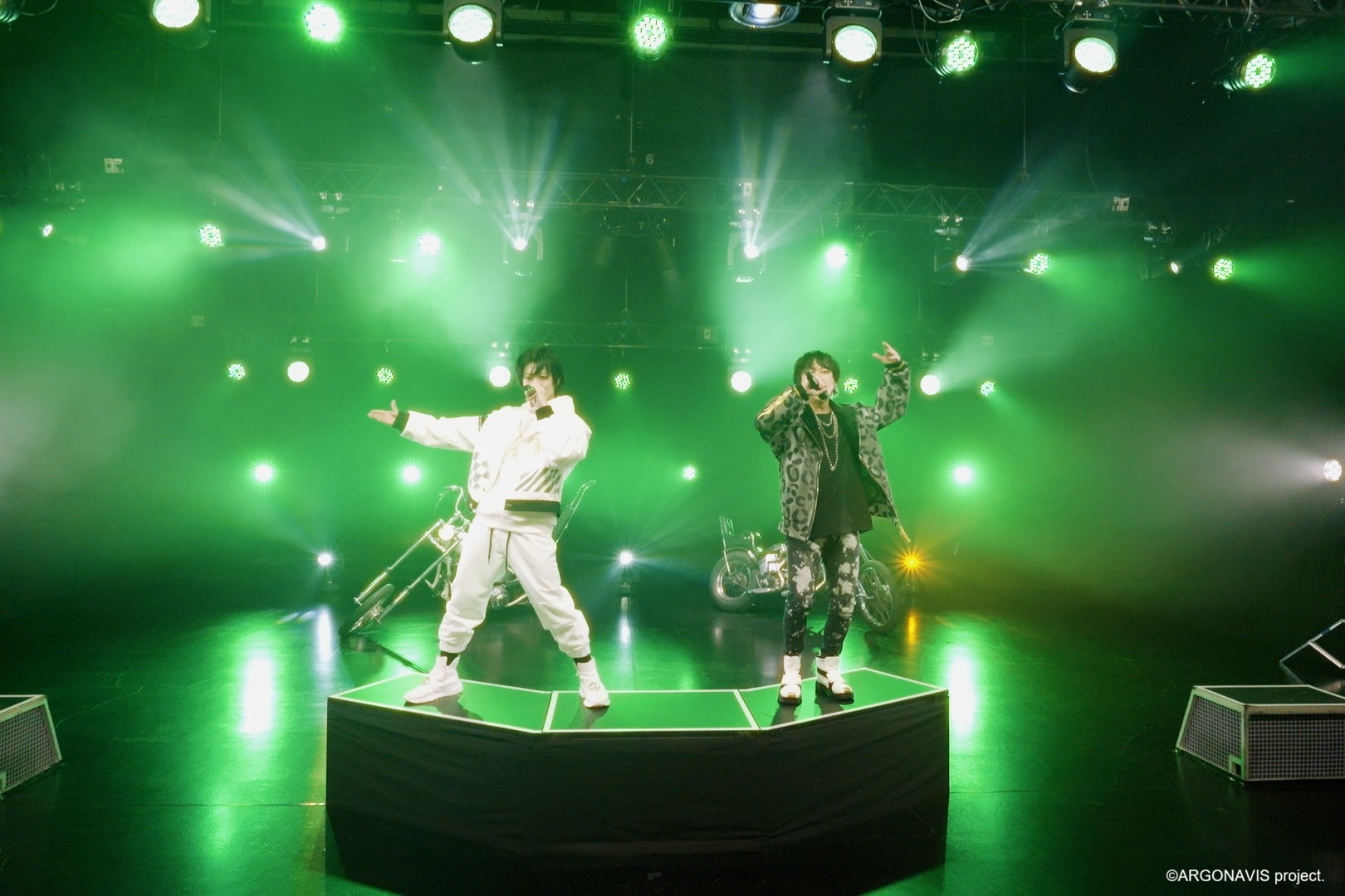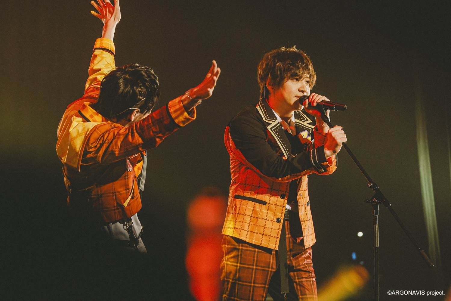 続く「絶叫フロンティア」は、攻撃力高めなロックナンバーだ。エフェクトのかかった天王寺のボーカルと、聴き惚れるしかない淀川のボーカルに圧倒される。歌い終えた天王寺が「楽しんどるか~?」と声を上げ、淀川が「今日をずっと楽しみにしてたよ」と伝える。続けて自分たちのこれまでを振り返り、観客に向けて「どんな壁にぶつかっても、俺たちや俺たちの歌が、必ずみんなのそばにいることを忘れないでほしい」と告げた。一方の天王寺は、「せやで! 俺らと一緒にデカい一歩、踏み出そうや。必要やったら、お前らの前走って引っ張ってくからな」と観客を勇気づけた。