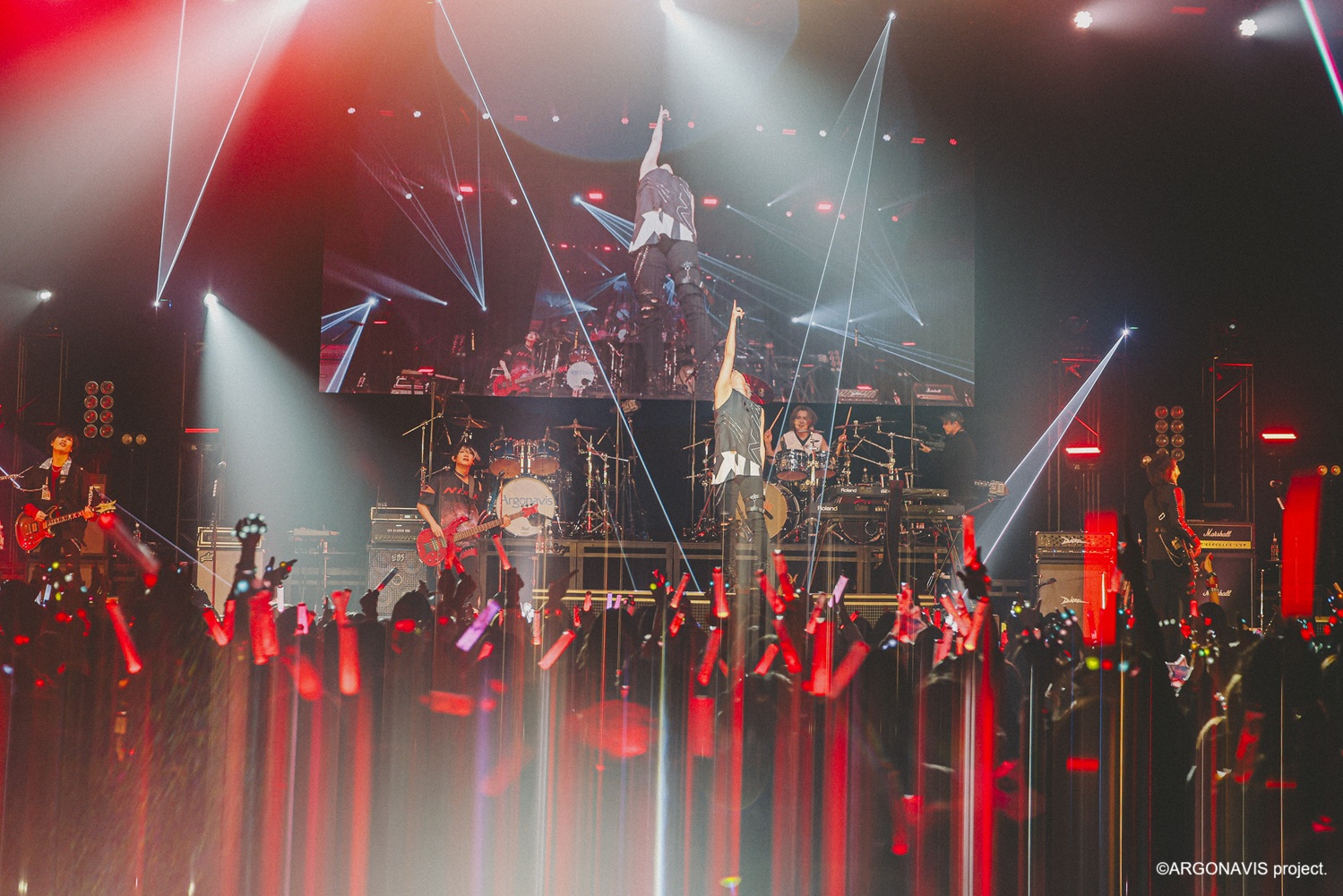 LIGHTに手渡されたグラスで喉を潤し、FELIXがメンバーを紹介。そして次に、「Vampire」と「Berserker」をかけ合わせて名付けられた「Vamserker」が演奏された。FELIXが「飛べ!」と眷属を煽り、LIGHTとZACKに「来い!」と命じツインソロを投下、会場を熱狂の渦に叩き込む。勢いはそのままに、人気の暴れ曲「Into the Flame」へ。ここではHARUがLIGHTの頭を撫でる一幕があったり、ZACKがHARUの顔を覗き込んだり、本曲ではお馴染みのFELIXとLIGHTの背中合わせの演奏をするなど、音楽だけでなく見どころもありすぎるひとときだった。
